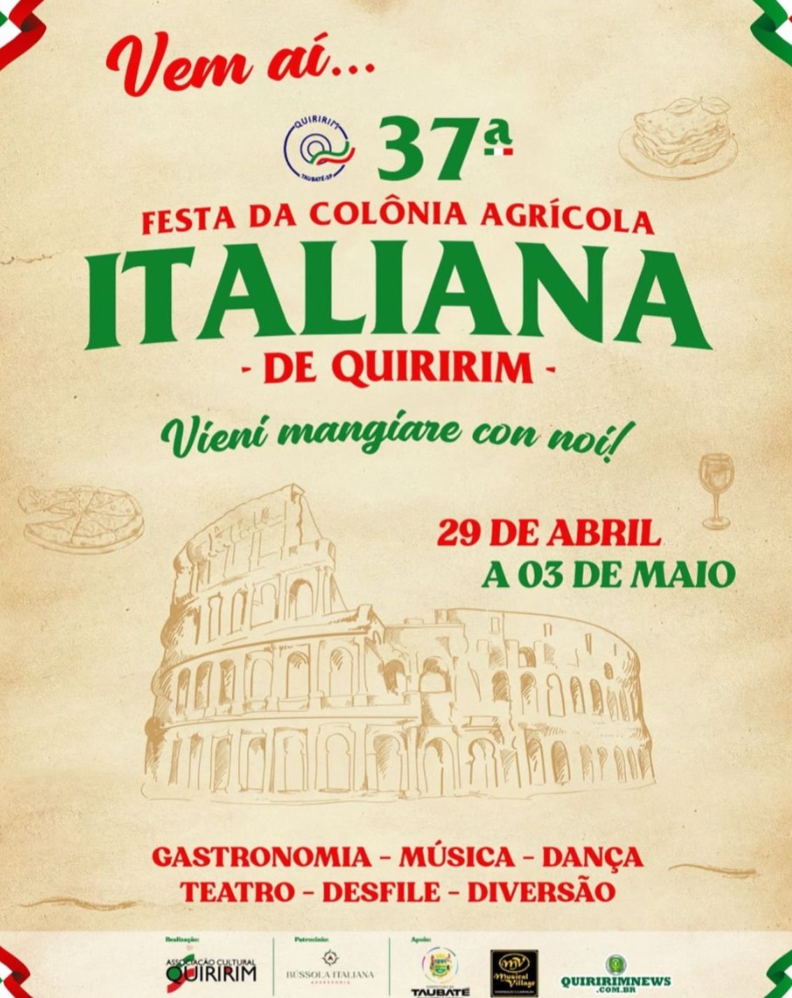 A 37ª Festa da Colônia Agrícola Italiana de Quiririm será realizada entre os dias 29 de abril e 3 de maio, no Distrito de Quiririm, em Taubaté. O evento é um dos mais tradicionais do Vale do Paraíba e terá entrada gratuita.