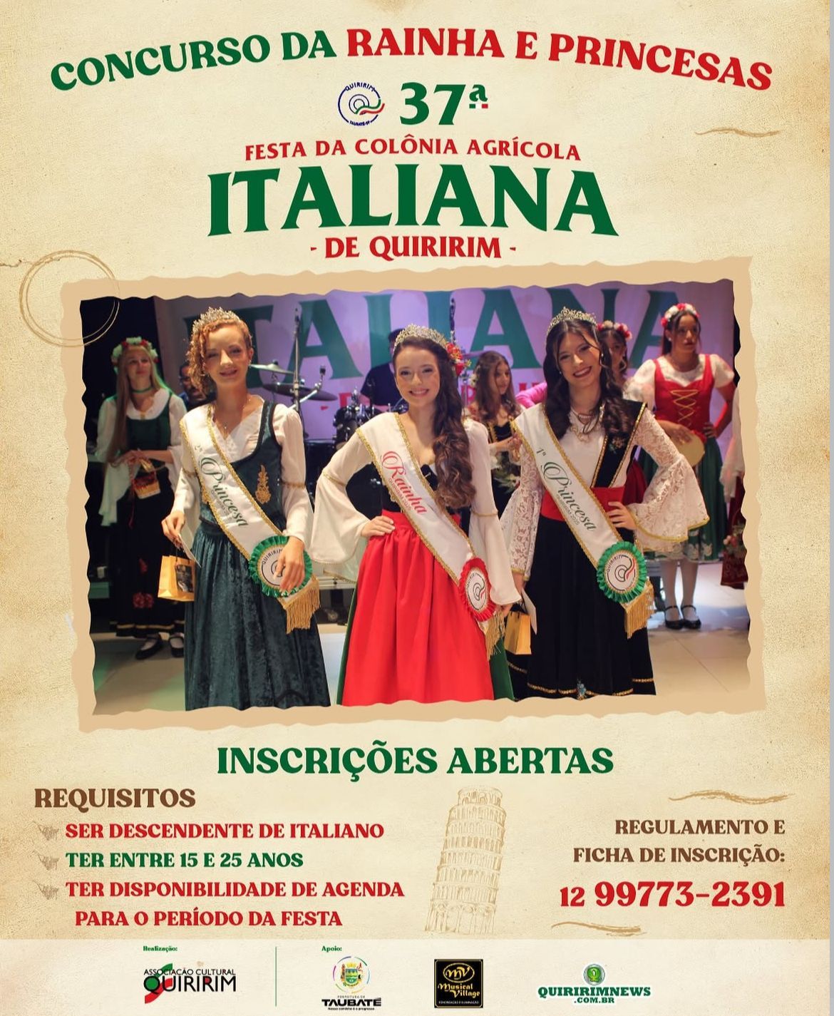 Além das atrações culturais e gastronômicas, a organização também abriu inscrições para o Concurso de Rainha e Princesas da 37ª edição. Para participar, é necessário ser descendente de italianos, ter entre 15 e 25 anos e disponibilidade durante o período da festa. Informações e regulamento podem ser obtidos pelo telefone (12) 99773-2391.