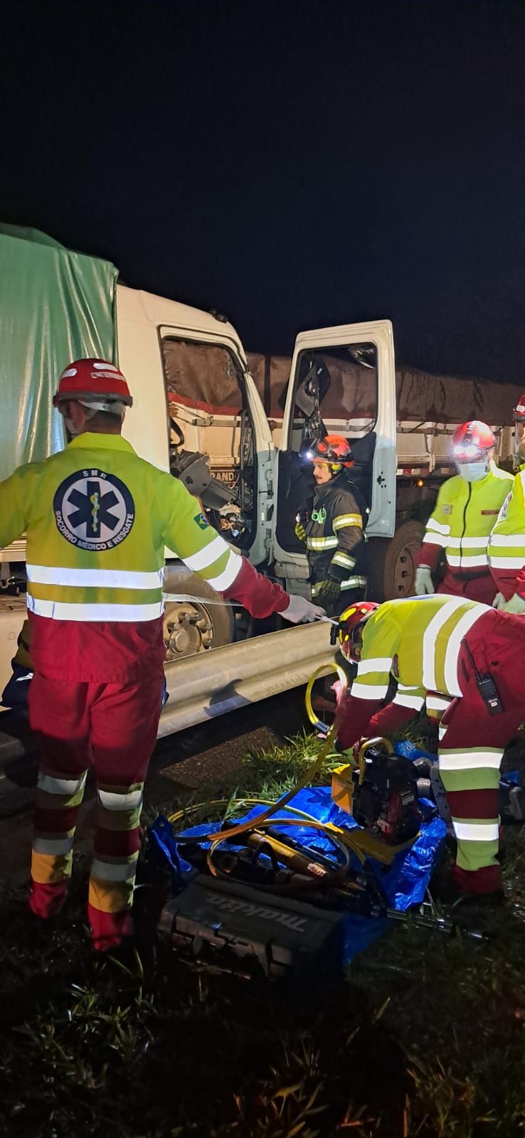 Devido à gravidade da ocorrência, diversas viaturas foram acionadas. As equipes realizaram o salvamento veicular com o uso de ferramentas hidráulicas para cortar e expandir a estrutura da cabine, permitindo o acesso seguro às vítimas.