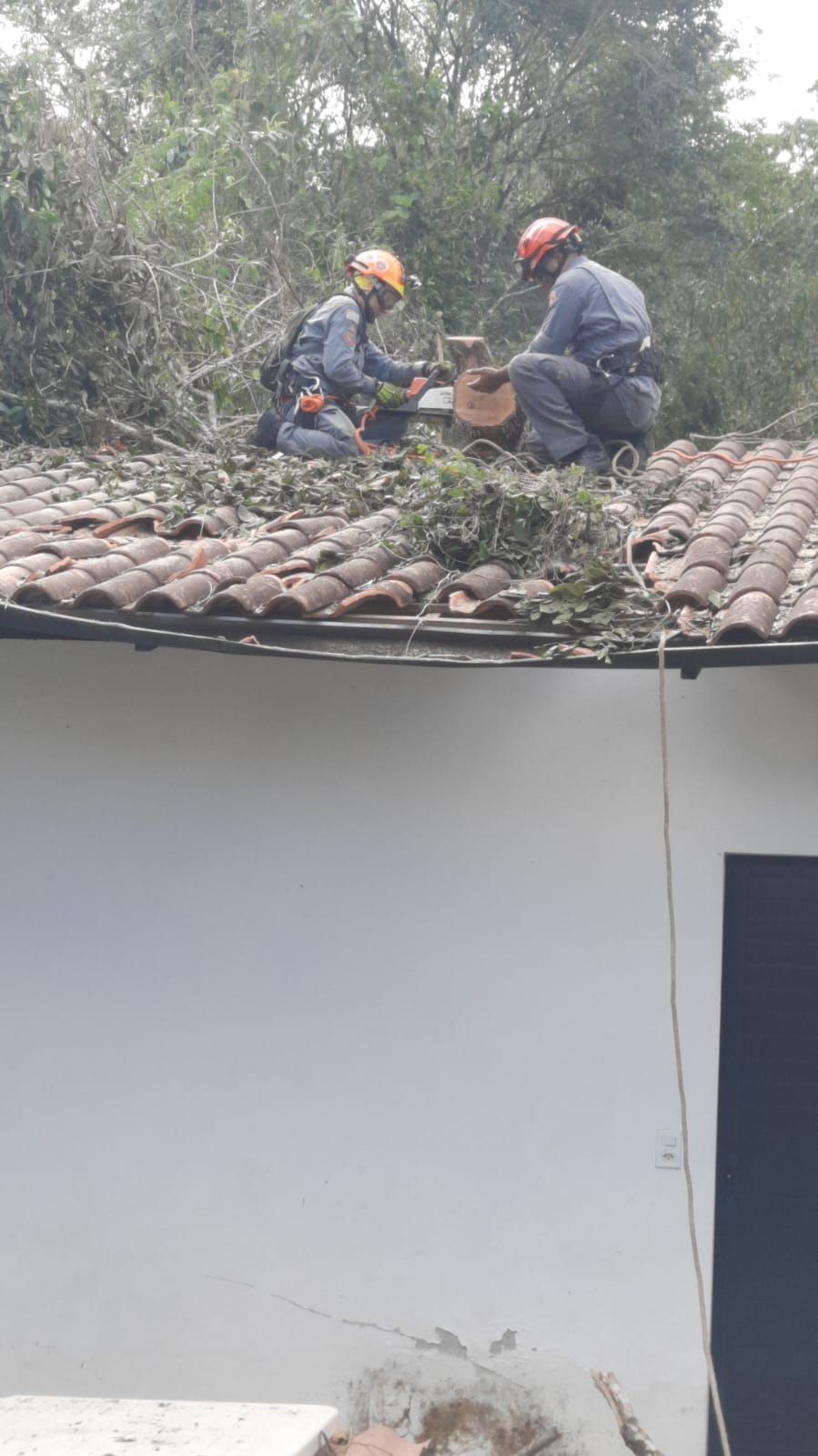 Moradores relataram que os fortes ventos que atingiram a região contribuíram para a queda da árvore. A equipe dos bombeiros realizou o corte e a retirada dos troncos que ficaram presos no telhado da casa.
