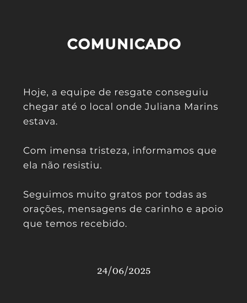 A confirmação da morte foi feita por meio de um comunicado oficial: "Hoje, a equipe de resgate conseguiu chegar até o local onde Juliana Marins estava. Com imensa tristeza informamos que ela não resistiu. Seguimos muito gratos por todas as orações, mensagens de carinho e apoio que temos recebido", diz a nota.