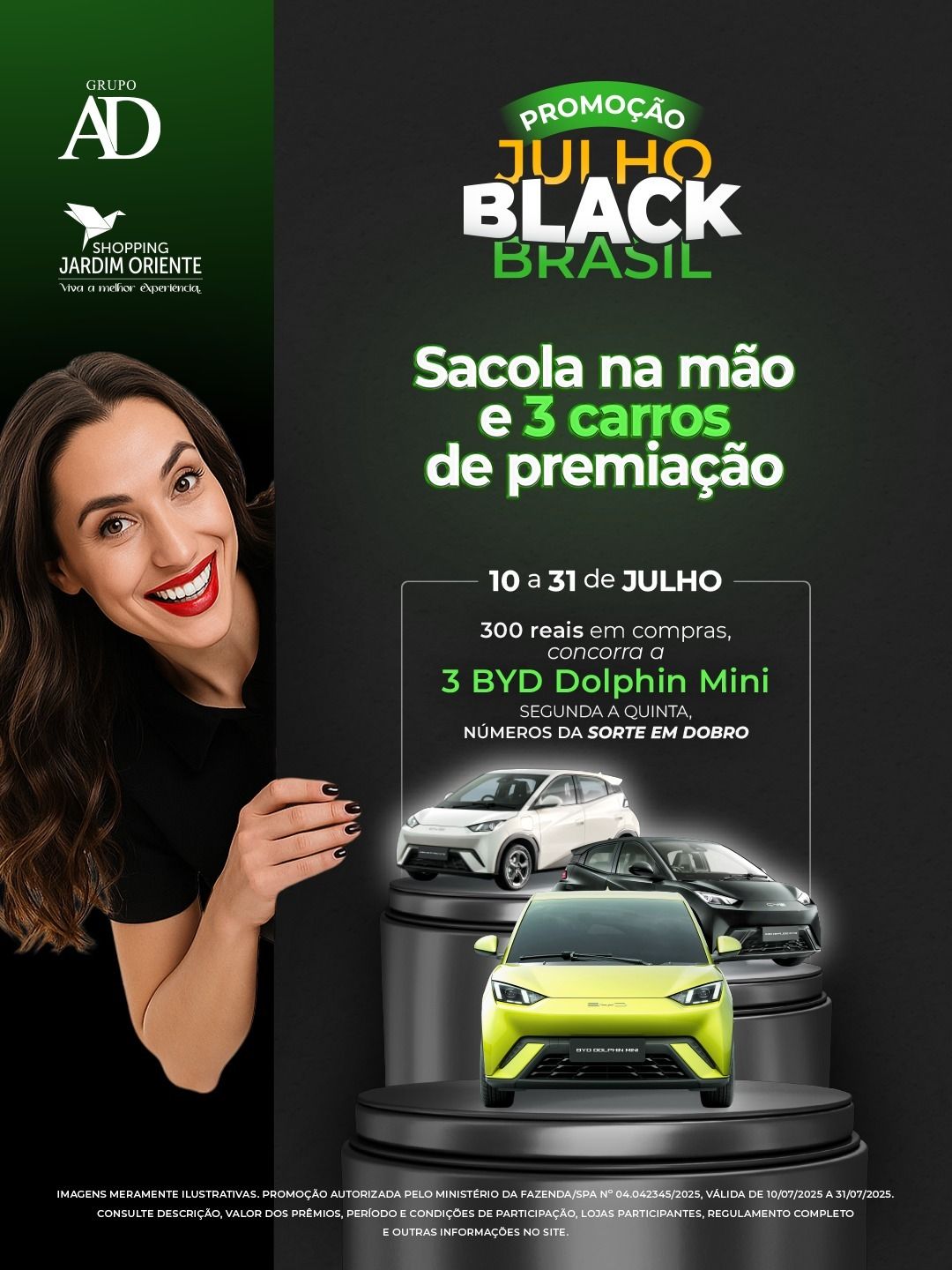 O Shopping Jardim Oriente, em São José dos Campos, participa da campanha Julho Black Brasil 2025, promovida pelo Grupo AD em 36 shoppings da rede em todo o país. A ação vai de 10 a 31 de julho e oferece aos clientes a chance de concorrer ao sorteio de três carros elétricos BYD Dolphin Mini, além de benefícios exclusivos para quem fizer compras no período.