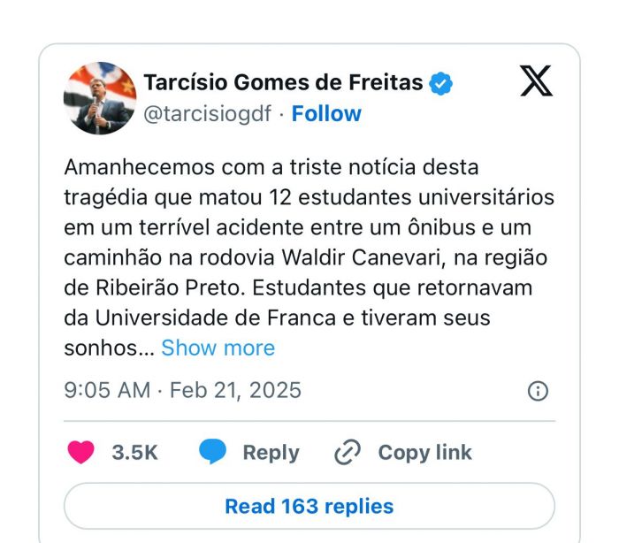 O governador de SP, Tarcísio de Freitas, lamentou o ocorrido, nas redes sociais, nesta manhã: