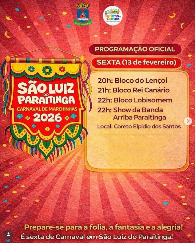 Quem vai curtir o Carnaval 2026 em São Luiz do Paraitinga já pode se programar. A Prefeitura divulgou a programação oficial da festa, que acontece entre os dias 13 e 17 de fevereiro. Reconhecida como uma das principais celebrações do Estado de São Paulo, a cidade terá cinco dias de blocos tradicionais, atrações infantis e shows musicais.
