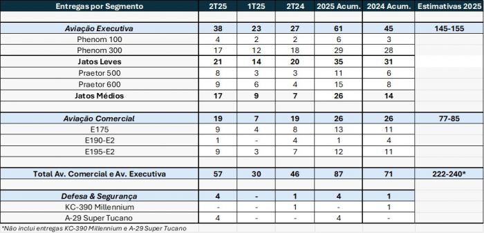 Na Aviação Comercial, foram entregues 19 aeronaves, mesmo volume do segundo trimestre de 2024, mas com aumento de 171% em comparação ao primeiro trimestre de 2025. Já a Aviação Executiva teve 38 entregas, superando em 41% o resultado do segundo trimestre de 2024 e com crescimento de 65% frente ao trimestre anterior. O segmento de Defesa & Segurança registrou quatro entregas de aeronaves A-29 Super Tucano.