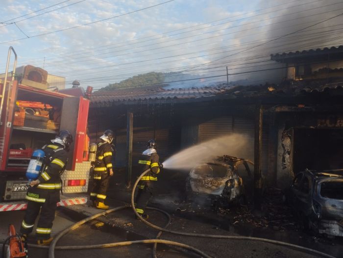 Ao chegarem no local, as equipes constataram que o fogo já havia consumido três veículos estacionados fora de oficinas mecânicas, além de se espalhar para outros no interior das oficinas e uma loja de esquadrias.