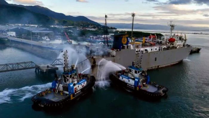 Durante o combate, o hidrante do porto apresentou falha e deixou de funcionar. Para garantir o abastecimento de água, caminhões-pipa foram deslocados até o local.