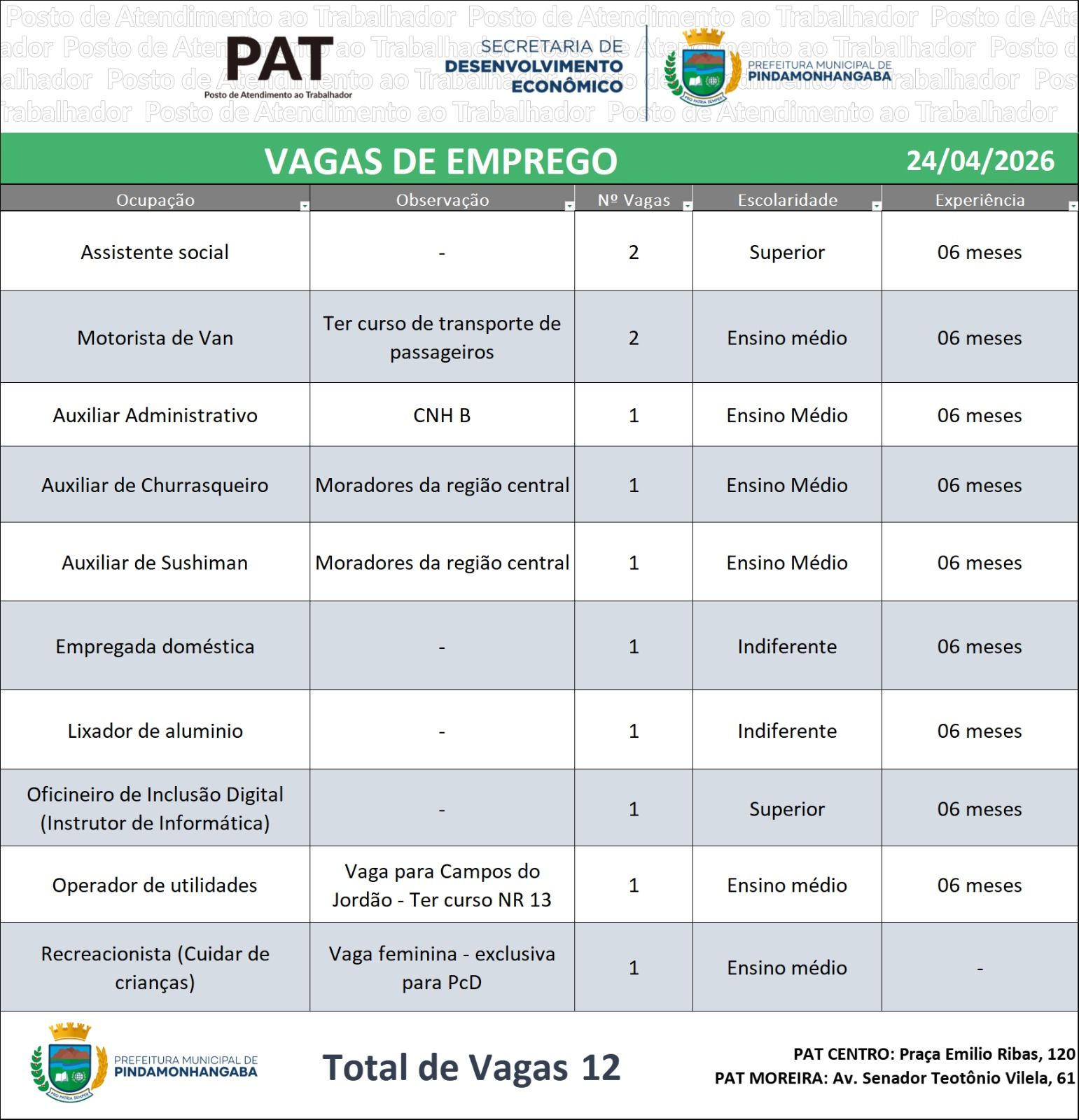 O Posto de Atendimento ao Trabalhador (PAT) de Pindamonhangaba divulgou nesta sexta-feira (24) a abertura de 12 vagas de emprego para diferentes áreas. As oportunidades estão disponíveis nas unidades do Centro e de Moreira César.