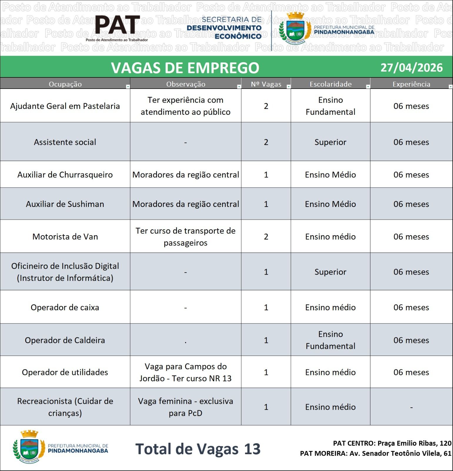 O Posto de Atendimento ao Trabalhador (PAT) de Pindamonhangaba divulgou, nesta terça-feira (27), novas oportunidades de emprego para moradores do município. Ao todo, são 13 vagas disponíveis em diferentes áreas, com exigência de escolaridade que vai do ensino fundamental ao superior.