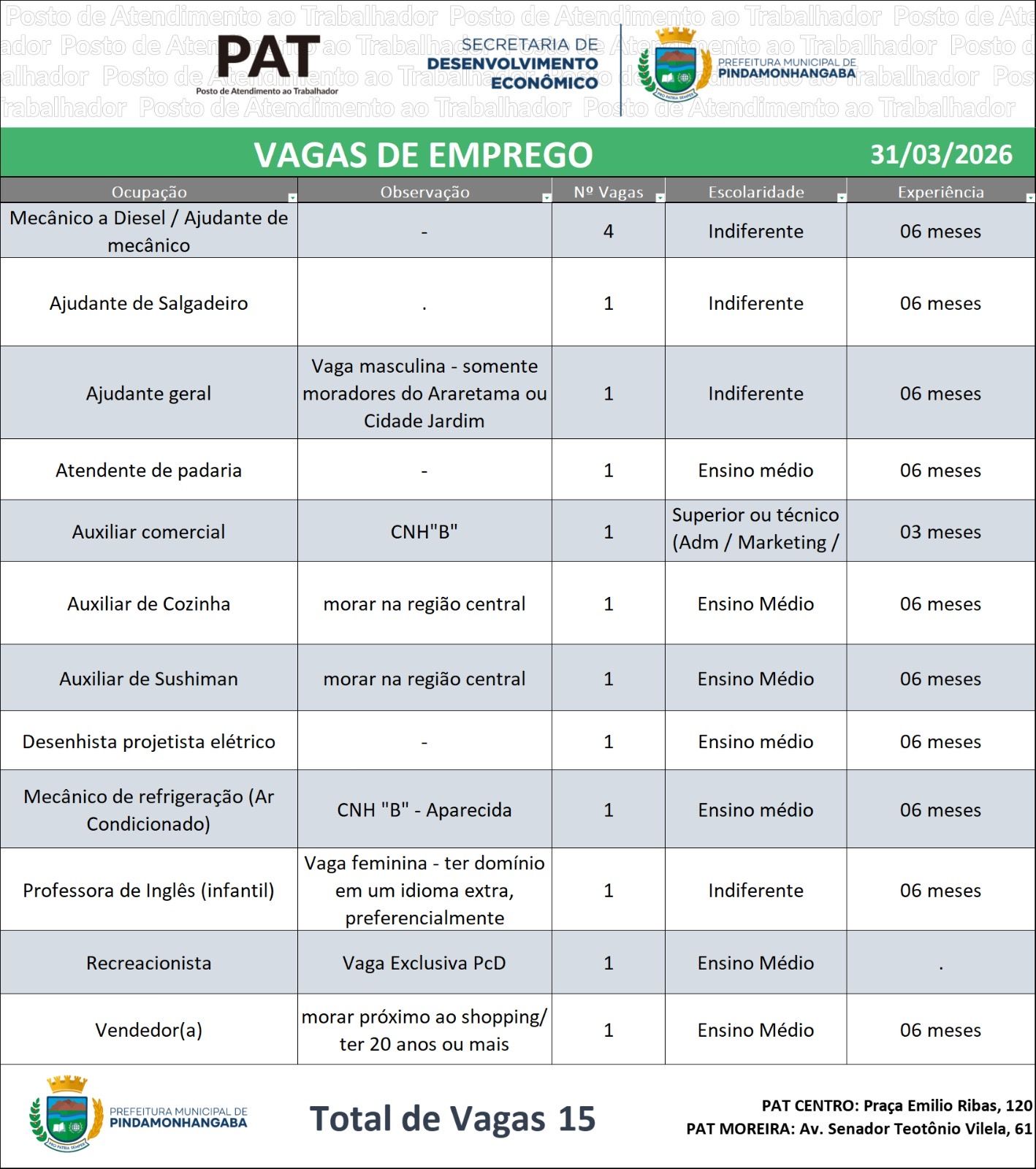 O Posto de Atendimento ao Trabalhador (PAT) de Pindamonhangaba divulgou nesta terça-feira (31) novas oportunidades de emprego para moradores da cidade. Ao todo, estão disponíveis 15 vagas em diversas áreas, com exigências variadas de escolaridade e experiência.