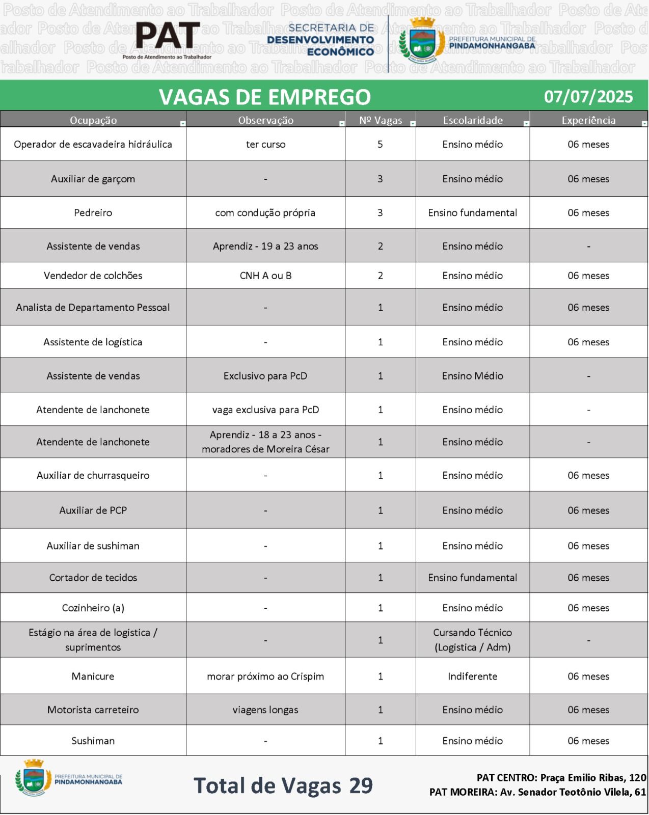 O Posto de Atendimento ao Trabalhador (PAT) de Pindamonhangaba iniciou esta segunda-feira (7) com 29 oportunidades de emprego em diversas áreas e níveis de escolaridade. Entre os destaques, há vagas para operador de escavadeira hidráulica, auxiliar de garçom, pedreiro, vendedor, cozinheiro, motorista carreteiro, entre outros.
