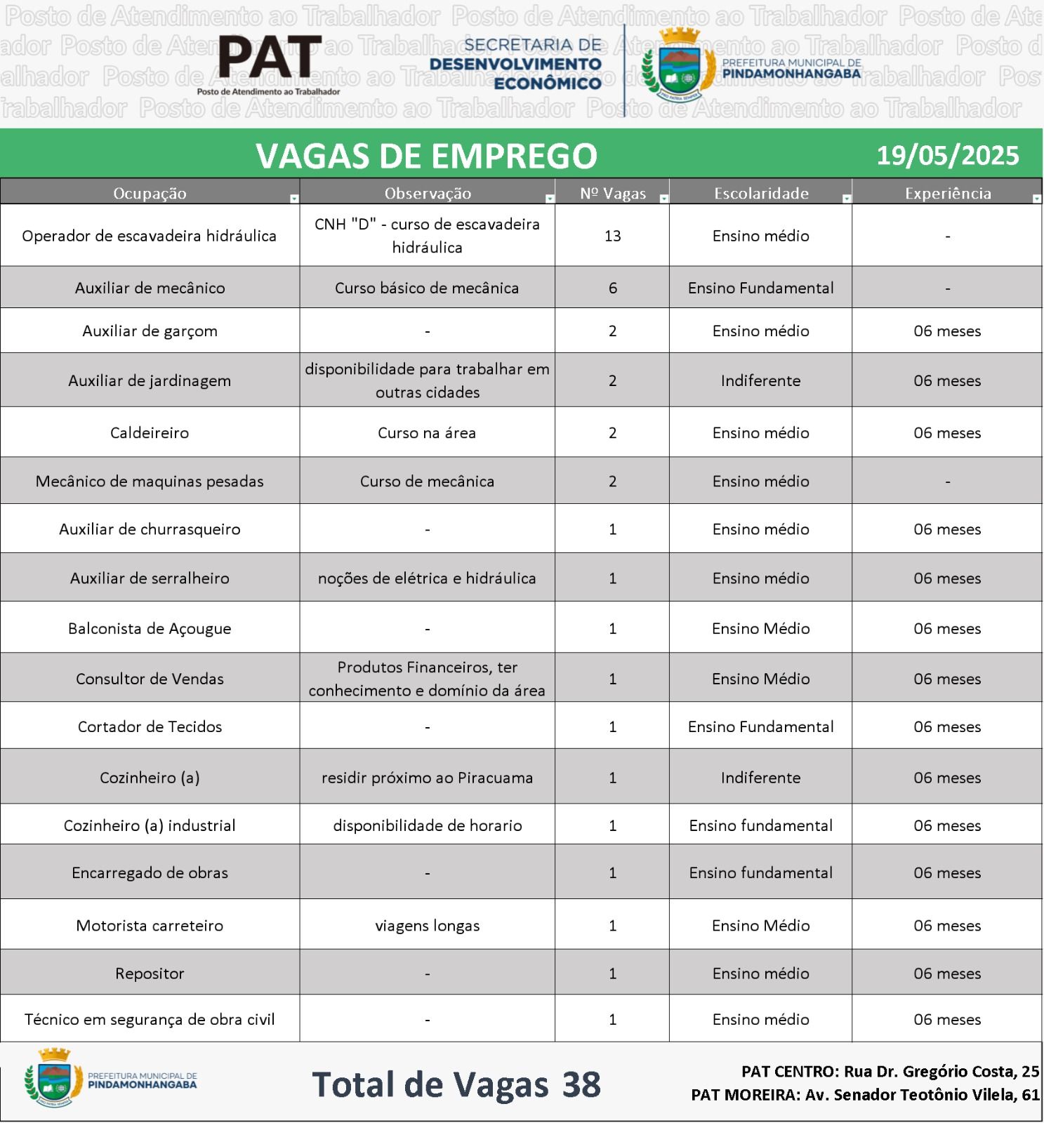 O Posto de Atendimento ao Trabalhador (PAT) de Pindamonhangaba divulgou nesta segunda-feira (19) um total de 38 vagas de emprego em diversas áreas. As oportunidades exigem diferentes níveis de escolaridade e, em sua maioria, experiência mínima de seis meses.