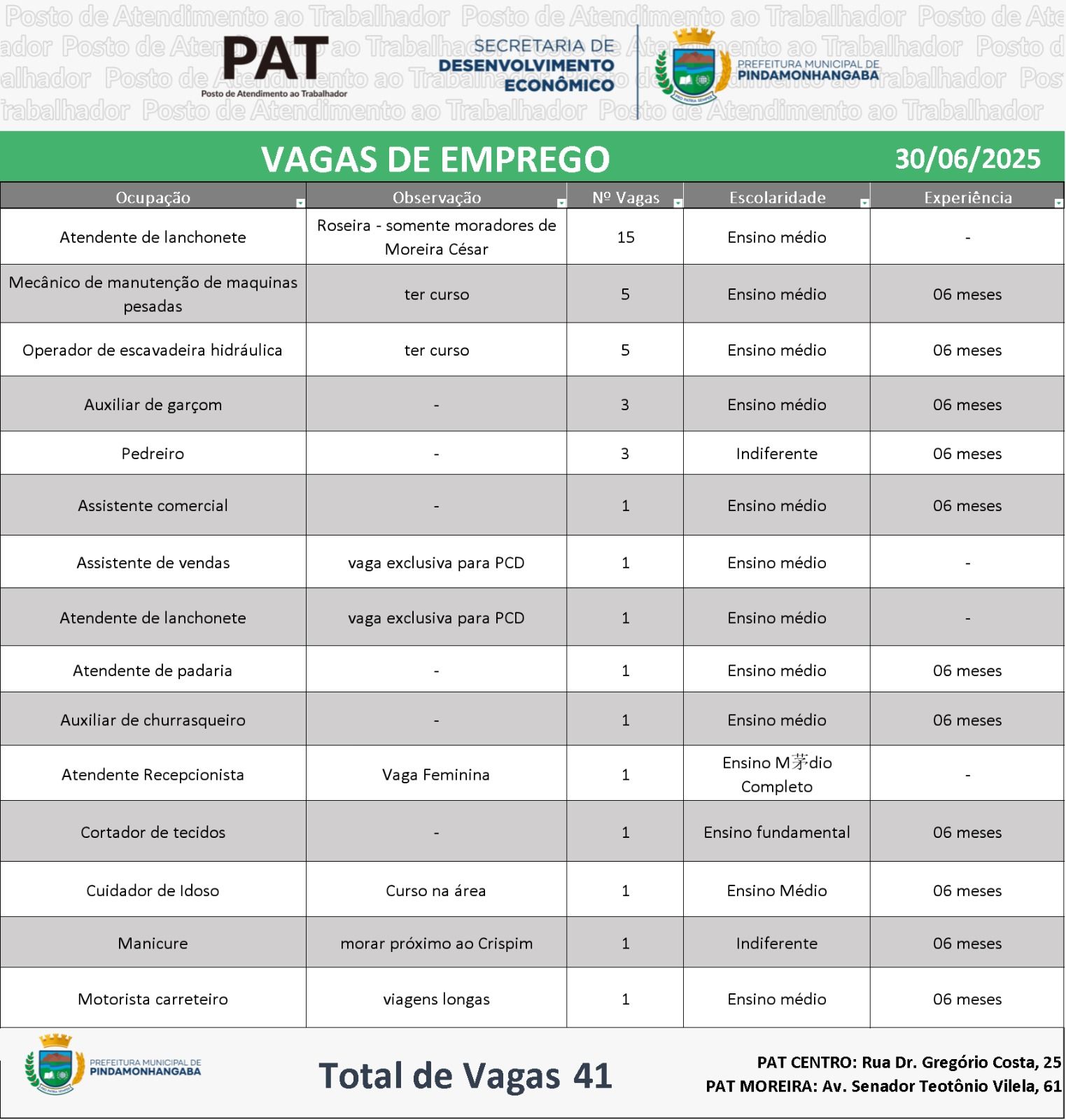 O Posto de Atendimento ao Trabalhador (PAT) de Pindamonhangaba divulgou, nesta segunda-feira (30), um total de 41 oportunidades de emprego em diferentes áreas e níveis de escolaridade. As vagas são destinadas a moradores da cidade e incluem também oportunidades exclusivas para pessoas com deficiência (PCDs).