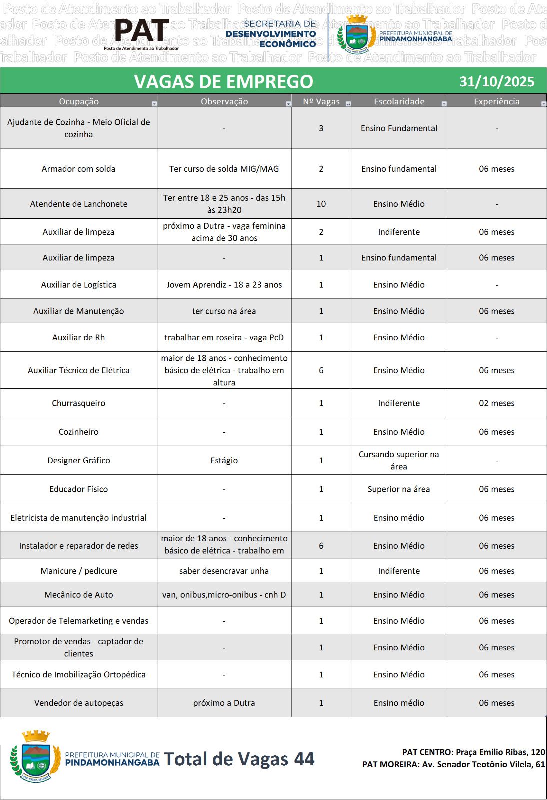 O Posto de Atendimento ao Trabalhador (PAT) de Pindamonhangaba abriu 44 vagas de emprego para candidatos com ensino fundamental, médio e superior. As oportunidades atendem moradores que buscam inserção ou recolocação no mercado de trabalho e contemplam funções em setores como comércio, serviços, manutenção, tecnologia e alimentação.