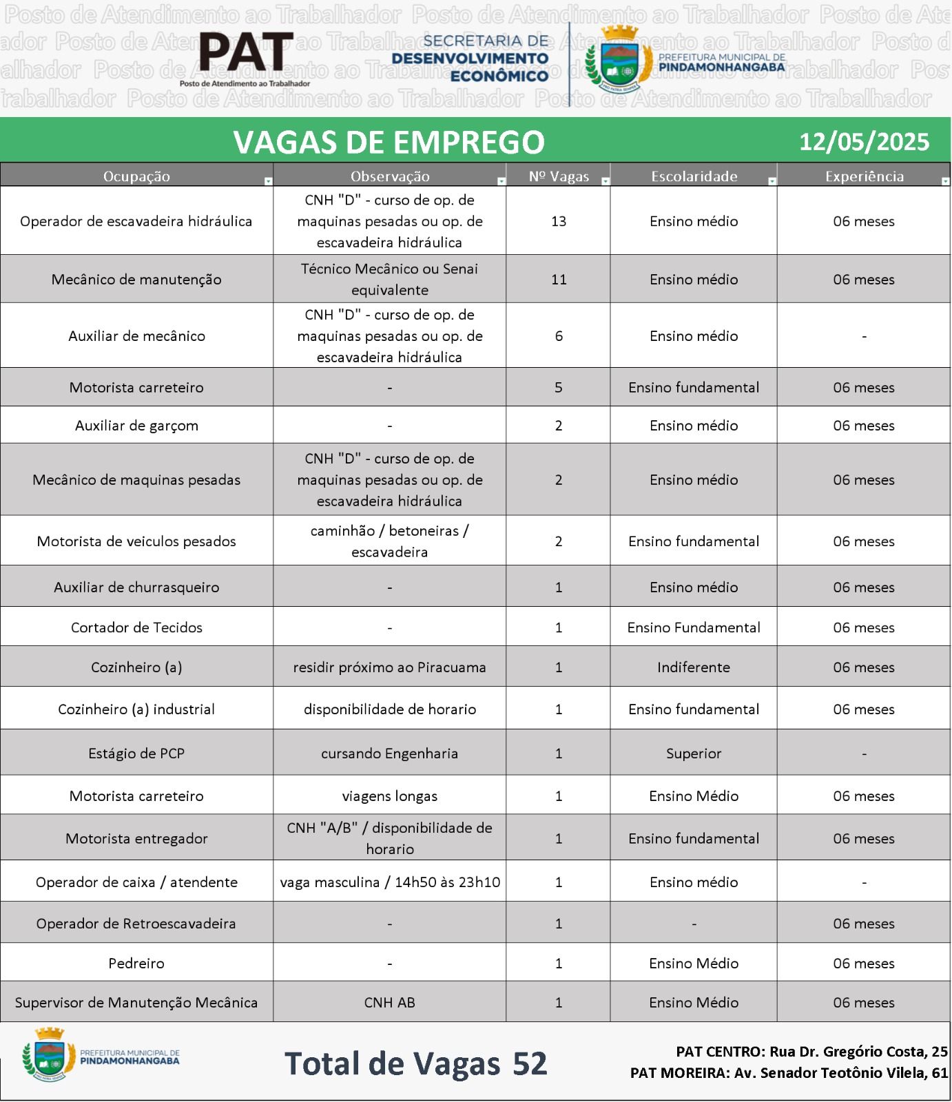 O Posto de Atendimento ao Trabalhador (PAT) de Pindamonhangaba divulgou nesta segunda-feira (12) um total de 52 vagas de emprego em diversas áreas e níveis de escolaridade. As oportunidades são voltadas para candidatos com ou sem experiência anterior, com exigência de escolaridade variando entre o ensino fundamental e o superior.