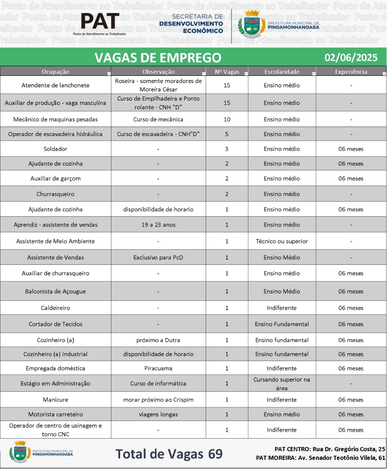 O Posto de Atendimento ao Trabalhador (PAT) de Pindamonhangaba está com 69 vagas de emprego abertas a partir desta segunda-feira (2). As oportunidades são destinadas a candidatos com diferentes níveis de escolaridade, com ou sem experiência, e contemplam diversas áreas profissionais.