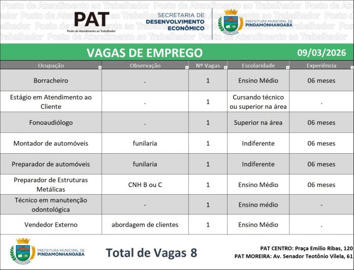 O Posto de Atendimento ao Trabalhador (PAT) divulgou nesta segunda-feira (9) novas oportunidades de emprego em Pindamonhangaba. Ao todo, estão disponíveis oito vagas em diferentes áreas.
