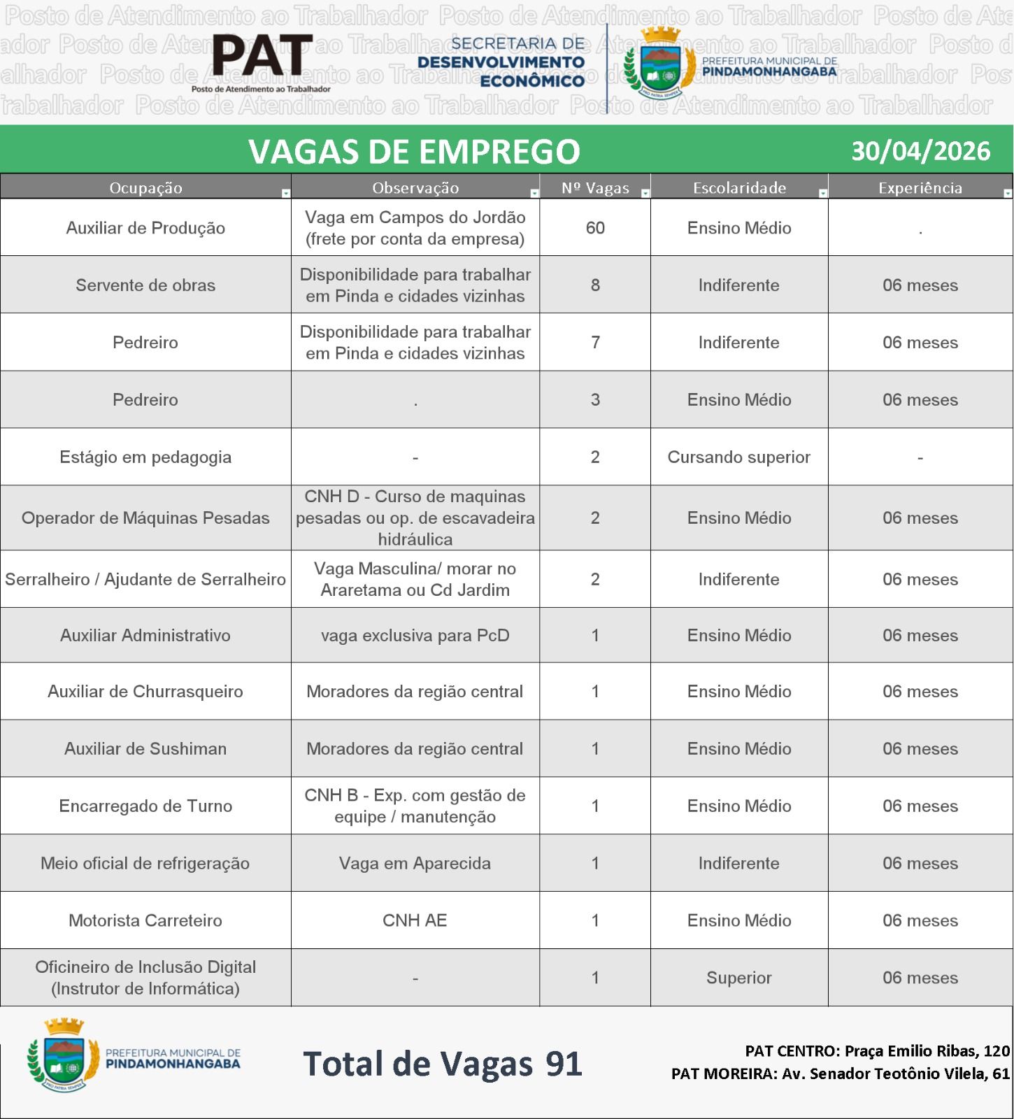 O Posto de Atendimento ao Trabalhador (PAT) de Pindamonhangaba disponibilizou nesta quinta-feira (30) um total de 91 vagas de emprego para diferentes áreas. As oportunidades atendem candidatos com variados níveis de escolaridade e experiência, incluindo opções sem exigência de formação específica.