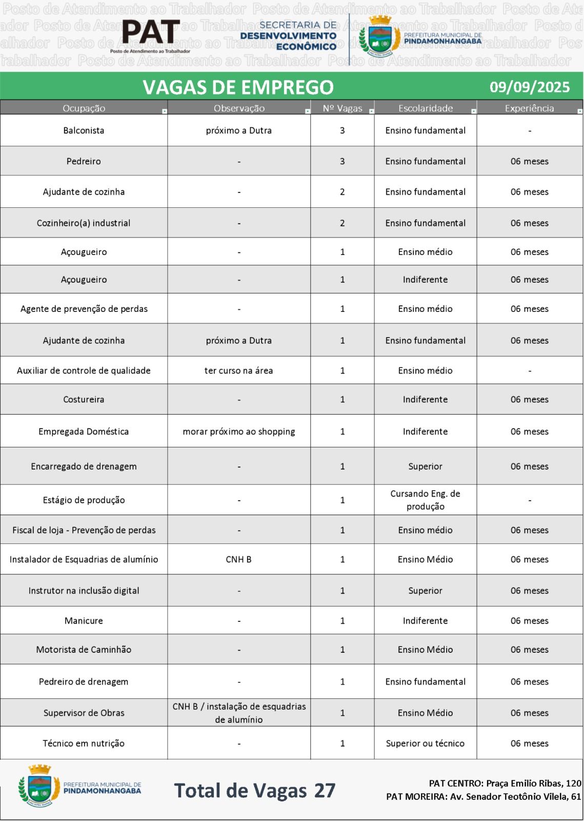 O Posto de Atendimento ao Trabalhador (PAT) de Pindamonhangaba divulgou, nesta terça-feira (9), um total de 27 oportunidades de emprego em diversas áreas. As vagas exigem diferentes níveis de escolaridade e experiência, ampliando as chances para quem busca uma colocação no mercado de trabalho.