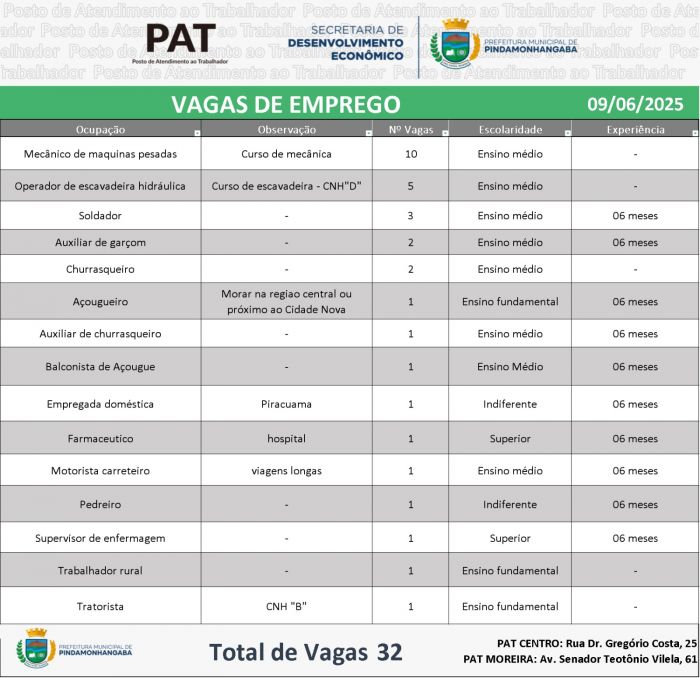 O Posto de Atendimento ao Trabalhador (PAT) de Pindamonhangaba divulgou, nesta segunda-feira (9), 32 vagas de emprego para diversas funções. As oportunidades são para candidatos com diferentes níveis de escolaridade e exigência de experiência varia conforme o cargo.