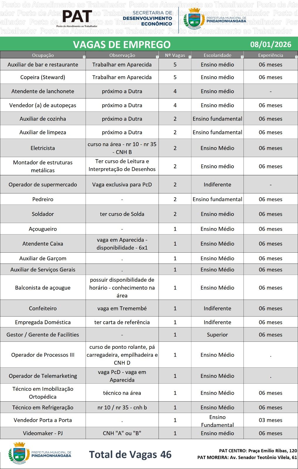 Os interessados devem procurar o PAT de Pindamonhangaba, que atende no PAT Centro, na Praça Emílio Ribas, e no PAT Moreira César, na Avenida Senador Teotônio Vilela, para mais informações sobre encaminhamento e candidaturas.