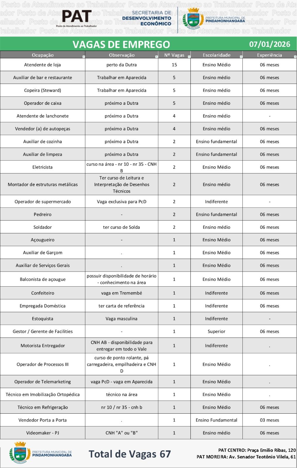 Os interessados devem procurar o PAT de Pindamonhangaba, levando documento com foto, carteira de trabalho e currículo atualizado. As vagas estão sujeitas a alteração conforme o preenchimento.