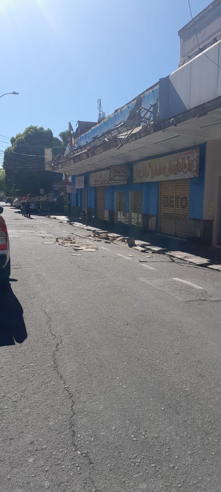 Placas de identificação de um hotel e uma loja desabaram no Centro de Pindamonhangaba após um ônibus de turismo esbarrar em fios conectados às estruturas. Com o impacto, parte do telhado e da marquise dos estabelecimentos foram danificados, além de dois carros que estavam estacionados no local.