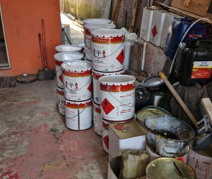 Ainda na sexta-feira, foram encontradas 25 latas de tinta e uma de solvendo em um imóvel no Distrito de Moreira César. O material, destinado à pintura de trânsito, foi localizado em uma residência particular.