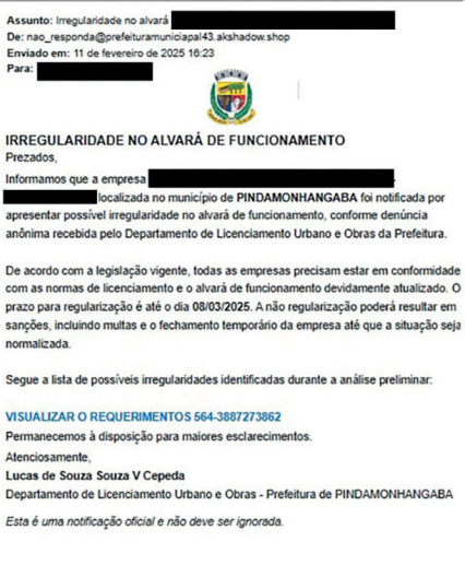 A Prefeitura de Pindamonhangaba emitiu um alerta à população sobre falsas mensagens que estão circulando, envolvendo alegações de irregularidade no alvará de funcionamento e cobranças de impostos. Nos últimos dias, golpistas têm utilizado o nome da Prefeitura para enviar e-mails fraudulentos solicitando a regularização de alvarás ou o pagamento de tributos em atraso.