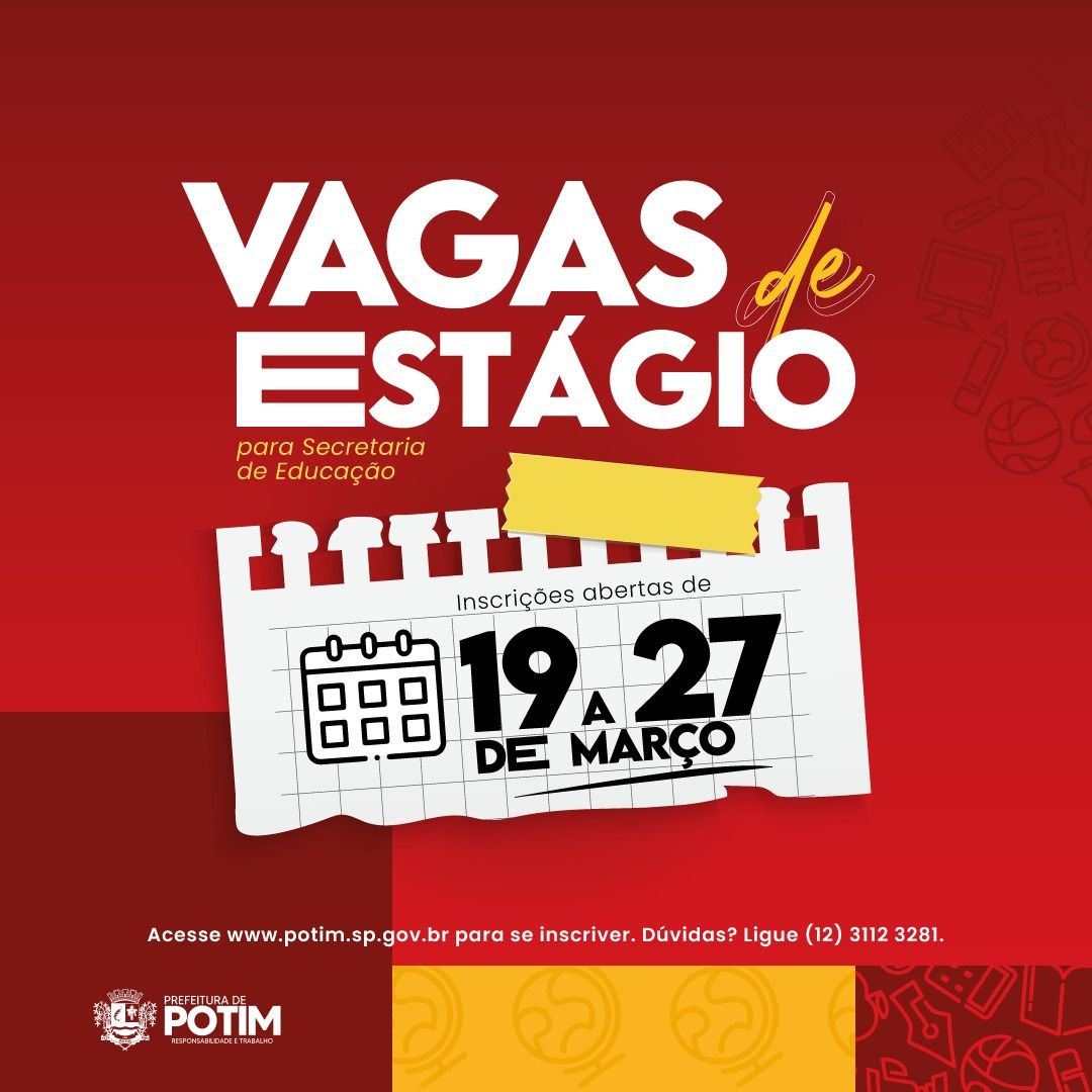 A Prefeitura Municipal de Potim abriu inscrições para o processo seletivo de cadastro reserva destinado a estagiários(as) de nível superior e técnico. As inscrições podem ser realizadas entre os dias 19 e 27 de março, e a publicação dos aprovados está prevista para o dia 4 de abril.