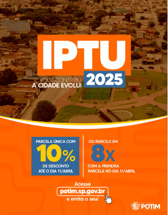 A Prefeitura de Potim informa que os carnês físicos começarão a ser entregues a partir do dia 20 de fevereiro de 2025.