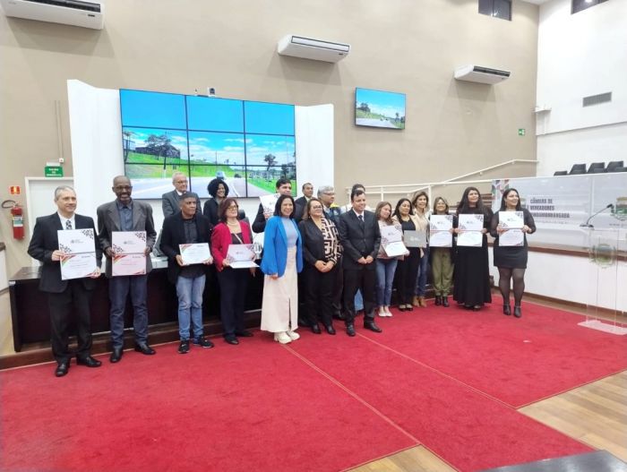 A sessão homenageou 11 conselheiros, representantes de diferentes áreas: Adriano Zanotti (CMDCA), Sueli Macedo Gimenez (CMI), Flávia Cristina (CME), Eliana Honorato (CMDM), Cláudia Gonçalves (CMAS), Raquel Dias (CMAS e CMDCA), Benedito Sérgio Irineu (CMPDCN), Larissa Néri (Meio Ambiente), Ana Maria Ladeluca (CMPHCAAP), Alexandre Silva (COMUS), Roberto Marquez (Conseg) e Pedro Alves da Cruz (CMPD).