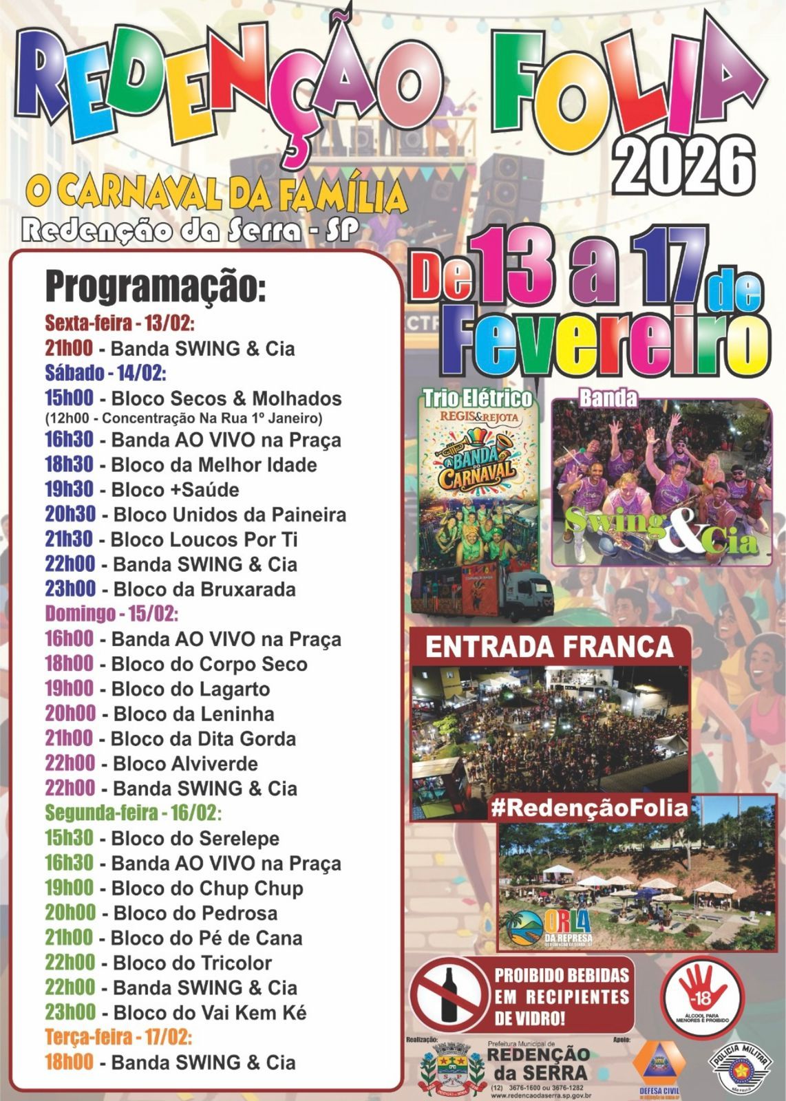 Redenção da Serra (SP) realiza de 13 a 17 de fevereiro o "Redenção Folia 2026 - O Carnaval da Família". O evento terá entrada franca e programação distribuída entre sexta-feira (13) e terça-feira (17), com apresentações de blocos, bandas e trio elétrico.