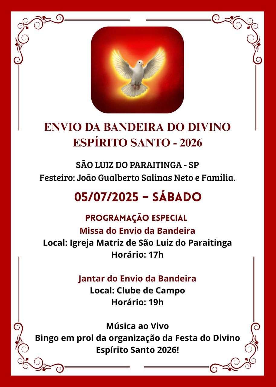 São Luiz do Paraitinga realizará, no sábado (5), uma das cerimônias mais emblemáticas de sua tradição religiosa e cultural: o Envio da Bandeira do Divino Espírito Santo. O evento marca oficialmente o início da preparação para a Festa do Divino de 2026, uma das celebrações mais antigas e significativas do interior paulista.