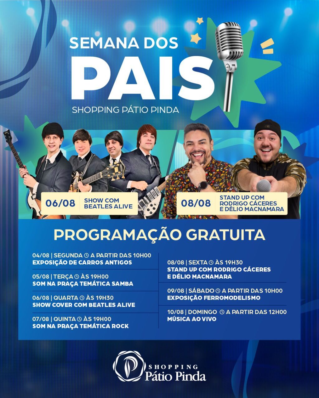 O Shopping Pátio Pinda preparou uma semana especial para comemorar o Dia dos Pais com atrações gratuitas que prometem agradar todas as idades. De 4 a 10 de agosto, o centro de compras recebe shows musicais, exposições e apresentações de humor, proporcionando momentos de lazer e conexão entre pais e filhos.
