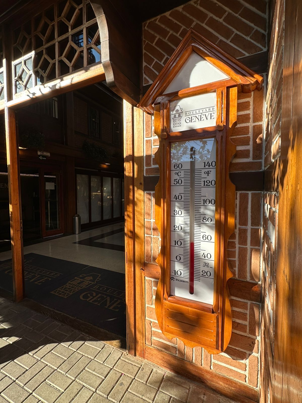 Com 2,10 metros de altura, o novo termômetro foi instalado na entrada principal do local. O equipamento com estética retrô utiliza a mesma linguagem visual do shopping center, cuja arquitetura se tornou referência e inspiração para o estilo enxaimel adotado em grande parte da cidade, e já é cenário para fotos do público por sua fachada típica alemã. Ao contrário de alguns prédios que usam o estilo enxaimel como inspiração decorativa, o Boulevard Gèneve segue rigorosamente a técnica de construção germânica, com estruturas de madeira aparentes formando um esqueleto visível preenchido com tijolos, pedras e argamassa. O Boulevard Gèneve reproduz uma vila europeia clássica com cada loja recebendo uma fachada com detalhes que as diferenciam, respeitando rigorosamente o estilo arquitetônico. O termômetro, que passa a integrar esse cenário mágico, foi um presente do fotógrafo Ricardo Castel Franklin, conhecido por suas imagens de Campos do Jordão, que já tem a torre do empreendimento como principal cartão-postal da cidade. O novo marco turístico promete momentos inesquecíveis e registros fotográficos que marcarão a memória do visitante.