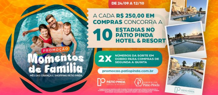 O Shopping Pátio Pinda preparou uma ação especial para comemorar o Mês das Crianças: a promoção "Momentos em Família". Até o dia 12 de outubro, a cada R$ 250 em compras realizadas nas lojas e quiosques participantes, os clientes poderão concorrer a 10 estadias no Intercity Pátio Pinda Hotel & Resort, que acaba de inaugurar sua nova área de lazer.