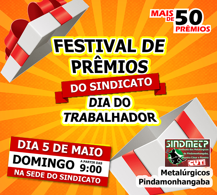O Sindicato dos Metalúrgicos de Pindamonhangaba vai realizar no próximo domingo, dia 5 de maio, um Festival de Prêmios em comemoração ao Dia do Trabalhador. O evento, com sorteio de mais de 50 prêmios, vai acontecer na sede da entidade, a partir das 9h.