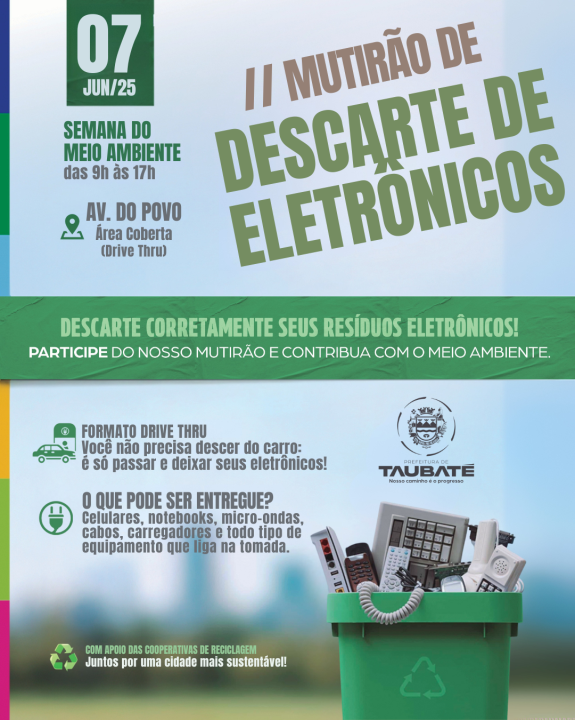 Como parte da programação da Semana do Meio Ambiente, que acontece na próxima semana, a Secretaria de Meio Ambiente e Bem-Estar Animal de Taubaté realizará no dia 7 de junho um mutirão de recolhimento de resíduos eletrônicos.