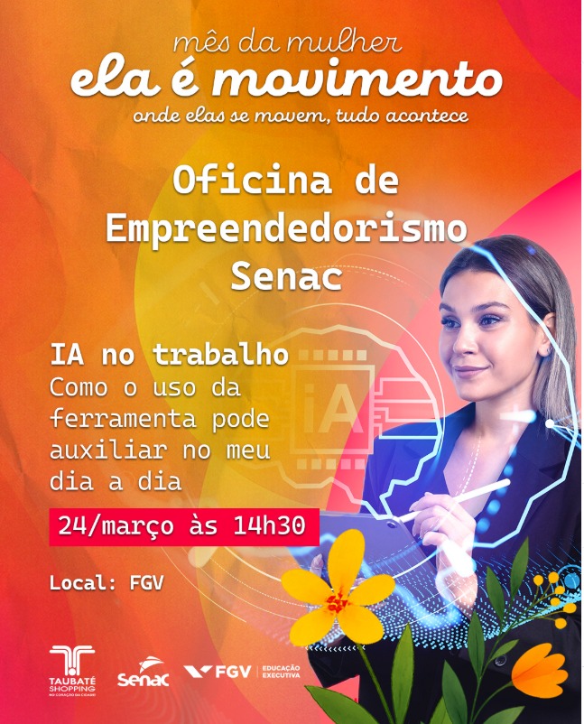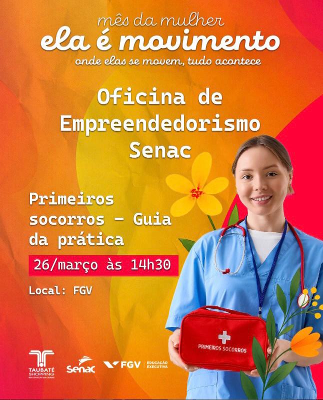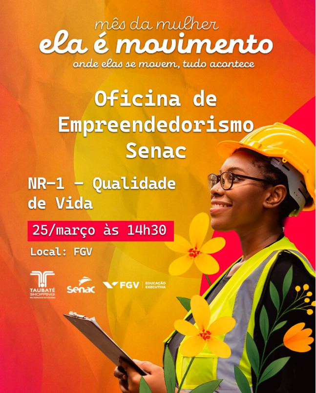 O Taubaté Shopping promove, entre os dias 24 e 26 de março, uma programação especial de oficinas gratuitas voltadas ao público feminino. A iniciativa faz parte das ações do Mês das Mulheres e ocorre em parceria com o Senac, com atividades sempre às 14h30, na unidade da FGV, próxima à academia Ultra.