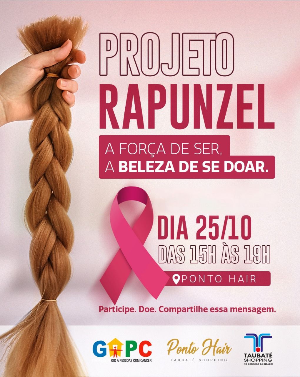 O Taubaté Shopping, administrado pelo Grupo AD, realiza neste sábado (25) o Projeto Rapunzel, uma ação solidária em apoio à campanha Outubro Rosa. A iniciativa acontece em parceria com o salão Ponto Hair e o GAPC (Grupo de Apoio a Pessoas com Câncer), com o objetivo de arrecadar mechas de cabelo para a confecção de perucas destinadas a pacientes atendidas pela instituição.