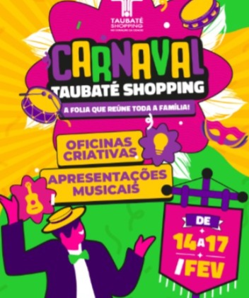 O Taubaté Shopping preparou uma programação especial para o Carnaval com atrações gratuitas voltadas para toda a família. Entre os dias 14 e 17 de fevereiro, o empreendimento recebe apresentações musicais, bloquinhos temáticos, oficinas e concursos que prometem animar crianças e adultos durante o período de folia.