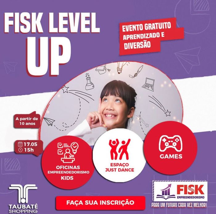 Em parceria com a escola de idiomas Fisk Taubaté, o shopping realiza neste sábado o FISK LEVEL UP, um evento voltado para jovens de 10 a 17 anos, com oficinas de empreendedorismo em frente à loja Renner. As atividades têm como objetivo estimular o pensamento crítico e o trabalho em equipe de forma lúdica.