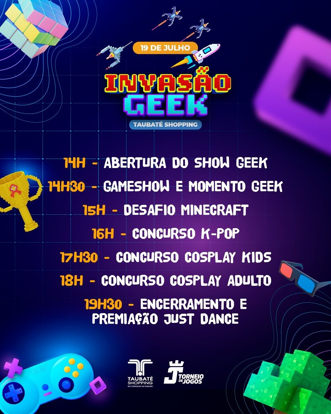 Programação completa: 14h: Abertura do Show Geek 14h30: Game Show e Momento Geek 15h: Desafio Minecraft 16h: Concurso K-pop 17h30: Concurso Cosplay Kids 18h: Concurso Cosplay Adulto 19h30: Encerramento e premiação Just Dance