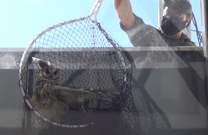 Quando o responsável pelo local chegou para trabalhar, ele percebeu que uma ave estava presa na janela, entre o vidro e uma placa de lona. Após resgatada, a coruja foi levada para avaliação veterinária e, por estar em boas condições e sem nenhum ferimento, foi devolvida à natureza nesta mesma tarde.