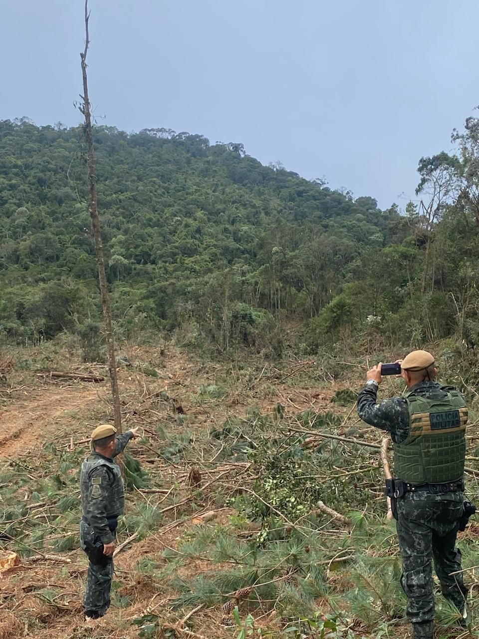 Foram constatados cortes isolados de 215 árvores nativas, algumas com o uso de motosserra e outras tombadas pela retirada de grandes exemplares de pinus.