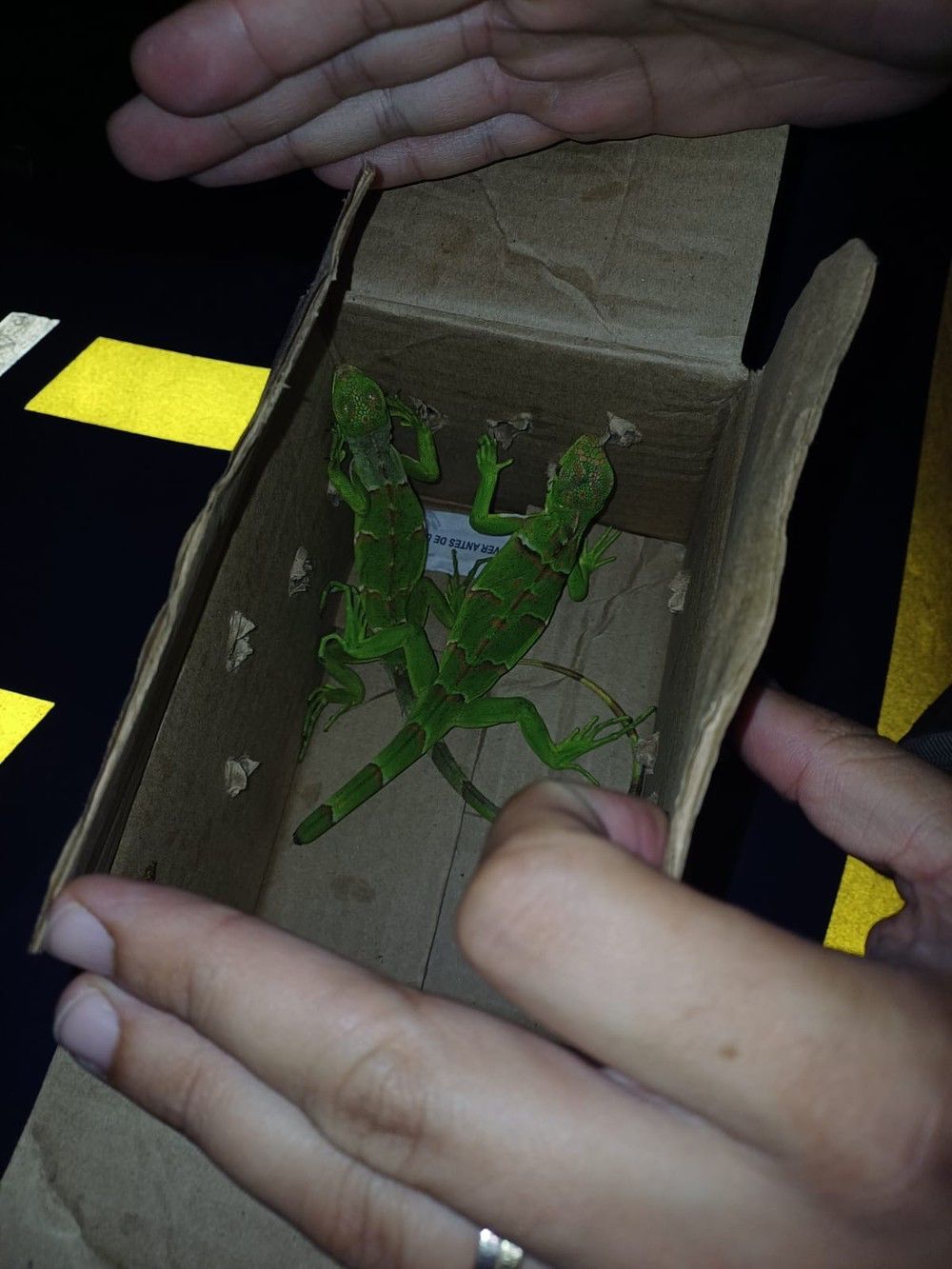 Durante a abordagem, o motorista informou que estava transportando um pacote de São Paulo para São José dos Campos, mas disse não saber o que havia dentro da encomenda. Ao abrir o pacote, os policiais encontraram duas iguanas verdes em condições de maus-tratos.