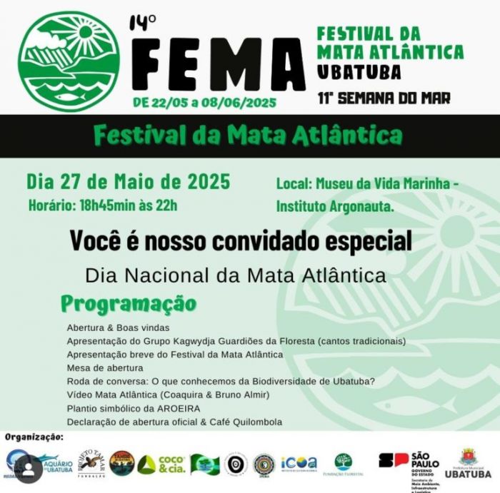 O XIV Festival da Mata Atlântica de Ubatuba e a XI Semana do Mar, tiveram início oficial terça-feira, 27, e segue até segunda-feira, 8 de junho, com uma programação diversificada para promover a conscientização sobre a importância da preservação da Mata Atlântica e sua biodiversidade.