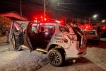 A viatura capotou três vezes consecutivas após colidir com um Fiat Argo branco durante uma operação de perseguição tática.