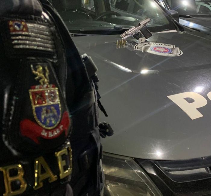 Com o criminoso, os policiais apreenderam uma pistola Taurus calibre .380 com a numeração suprimida, quatro munições intactas e um celular.
